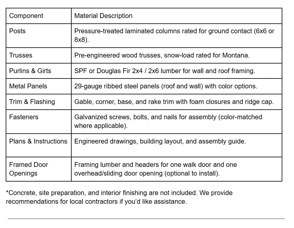 Each kit is crafted with Amish precision and Montana durability in mind. Below is a guide to our most popular DIY pole barn kit sizes; all fully customizable upon request.