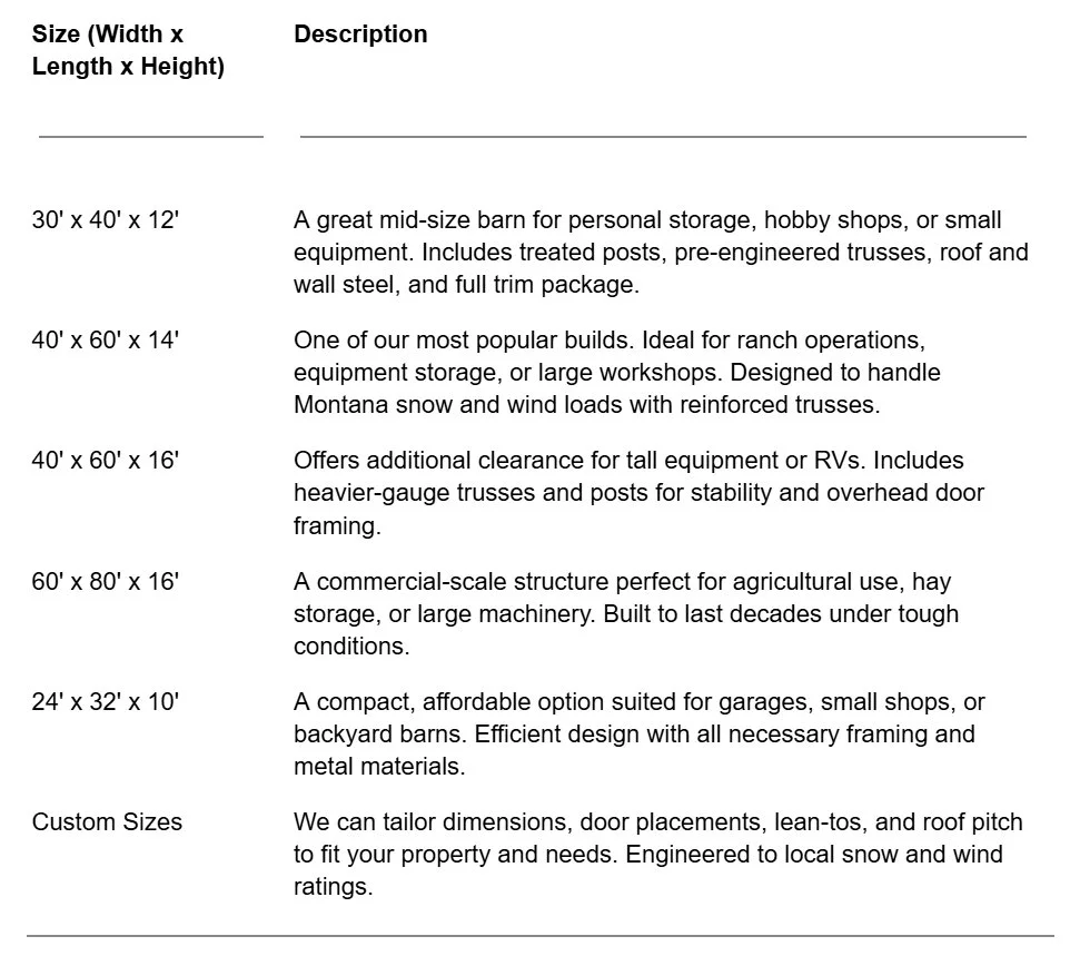 If your property calls for something unique; a lean-to extension, horse stall layout, or mixed use barndominium shell, we’ll work with you to design a structure that meets your exact needs. Custom sizes are available up to 80’ spans and beyond, with all materials engineered for Montana weather and terrain.